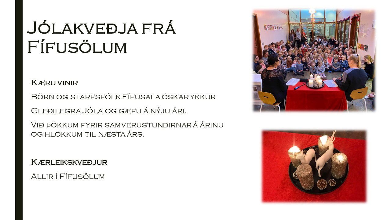 Við í Fífusölum óskum ykkur gleðilegra jóla og gæfu á komandi ári. Þökkum einnig fyrir allar stundirnar á árinu bæði með ykkur og börnunum ykkar og hlökkum til komandi ævintýra með þeim
